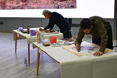 刘辉、范明两位老师在现场作画。两位老师凝神运气、挥毫泼墨,创作出一幅幅惟妙惟肖、栩栩如生的绘画作品,不仅展现了书画艺术的魅力,弘扬了中华民族传统文化精髓,更展现出了山水画中的中国精神、中国价值、中国力量。