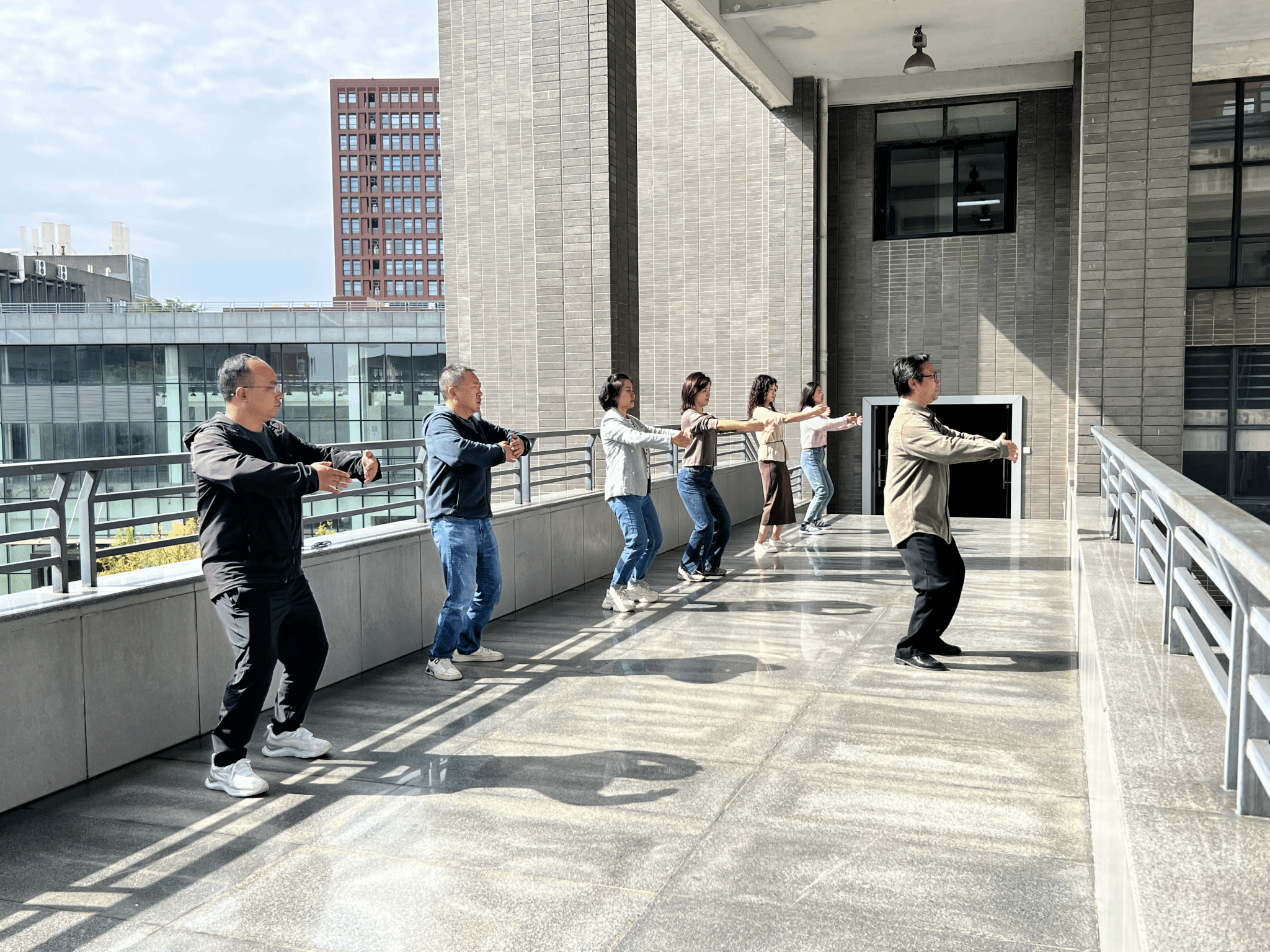 八段锦作为我国传统养生功法,动作柔和缓慢,简单易学,且不受场地限制,非常适合在办公区进行练习。通过调身、调息、调心,能够有效缓解肩颈腰背酸痛、改善睡眠质量、增强免疫力,对长期伏案工作的教职工而言,是一项非常有益的健身活动。